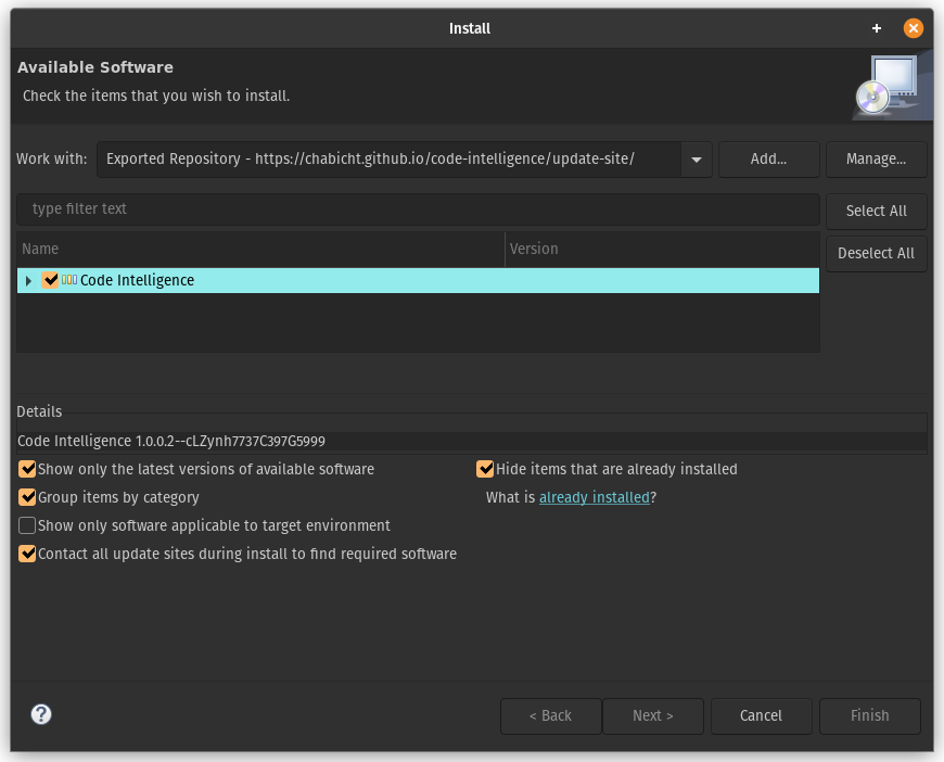 • Location: https://chabicht.github.io/code-intelligence/update-site/